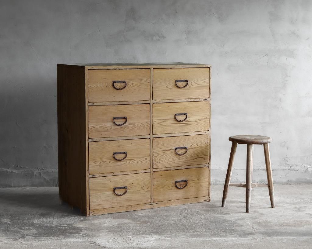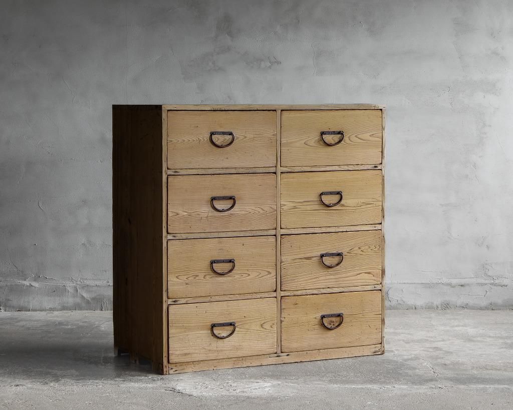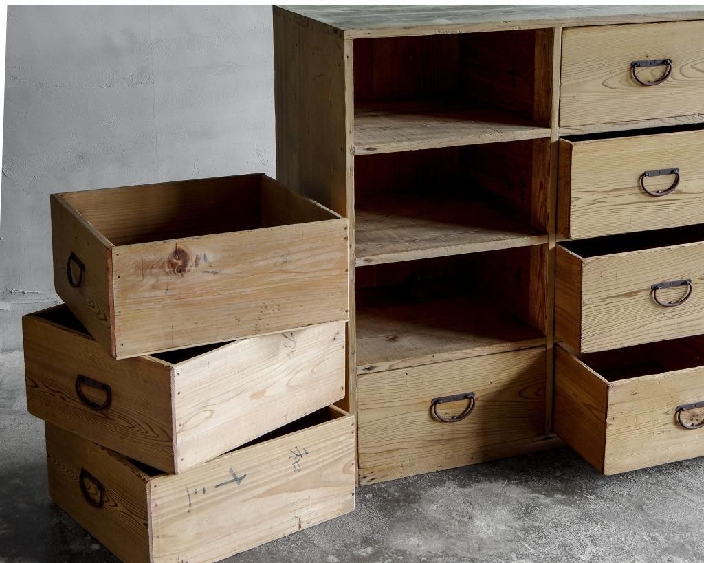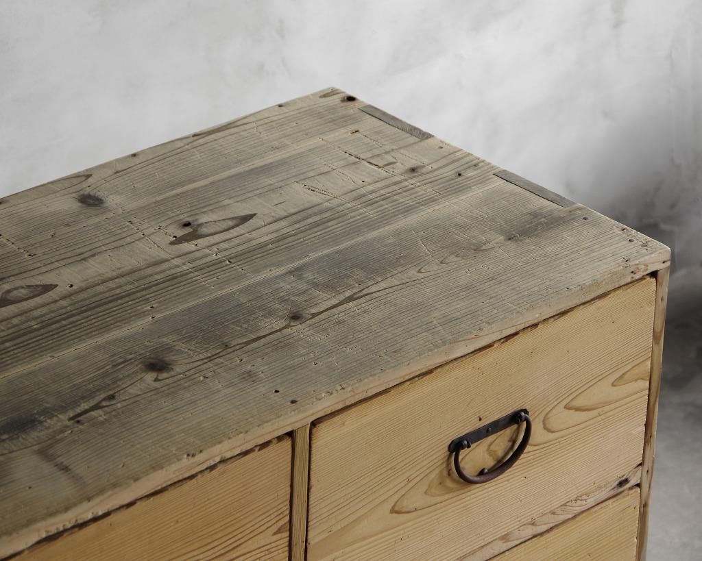 古い家具ですので、キズ、凹み、シミ、軽微なワレ等。金具類にはサビなどある場合もございますが、家具として使用上問題ないものは味わいとして残しています。