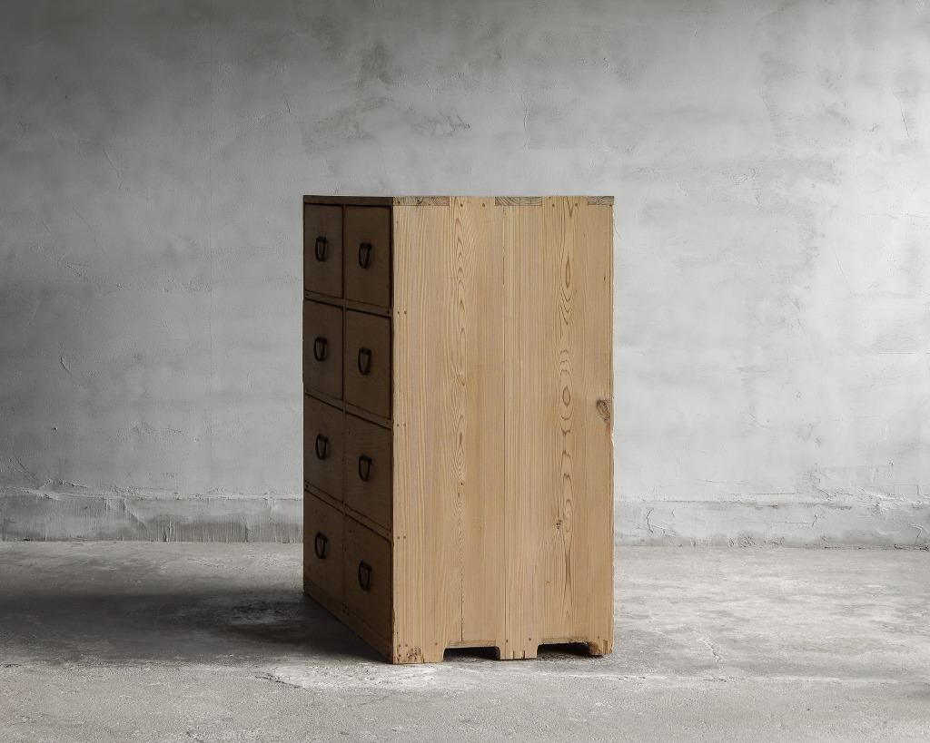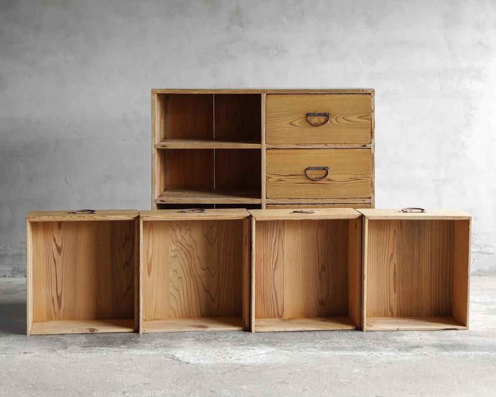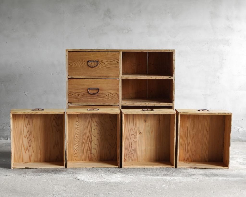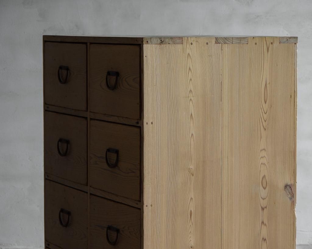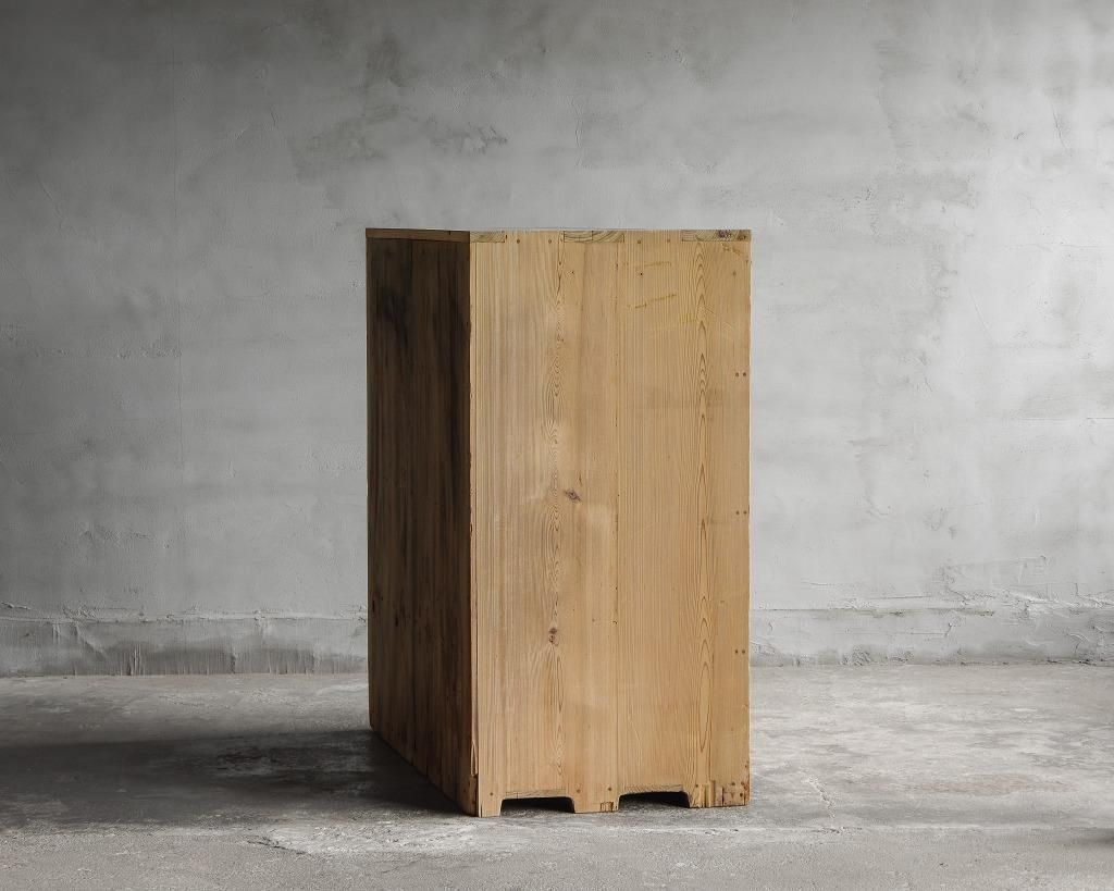 古い家具ですので、キズ、凹み、シミ、軽微なワレ等。金具類にはサビなどある場合もございますが、家具として使用上問題ないものは味わいとして残しています。