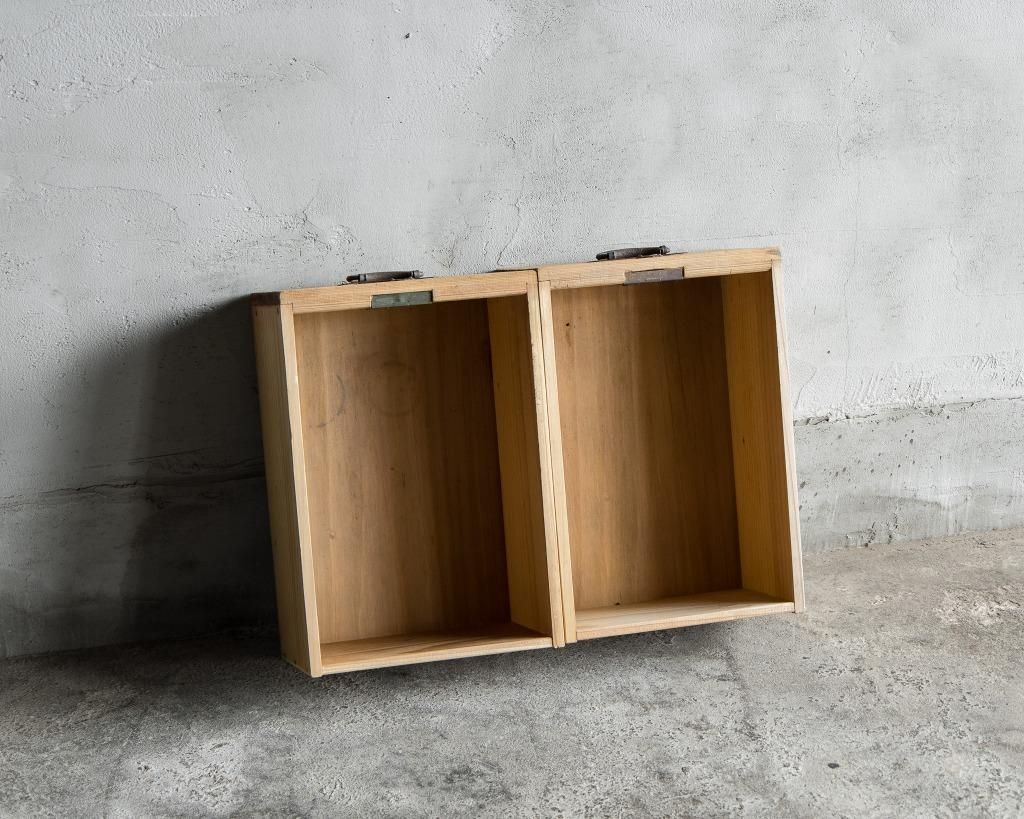 古い家具ですので、キズ、凹み、シミ、軽微なワレ等。金具類にはサビなどある場合もございますが、家具として使用上問題ないものは味わいとして残しています。