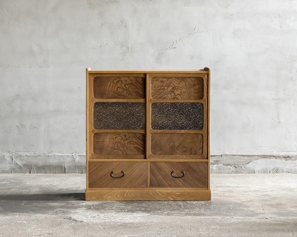 本体に栓材を用い、引き戸や引き出し前板には欅を合わせたつくり。