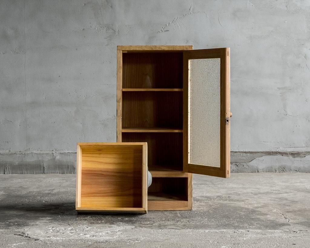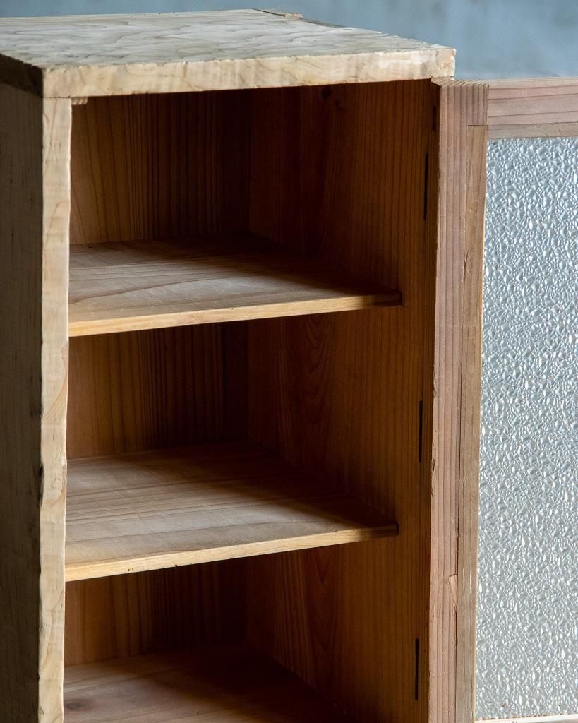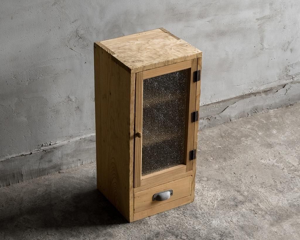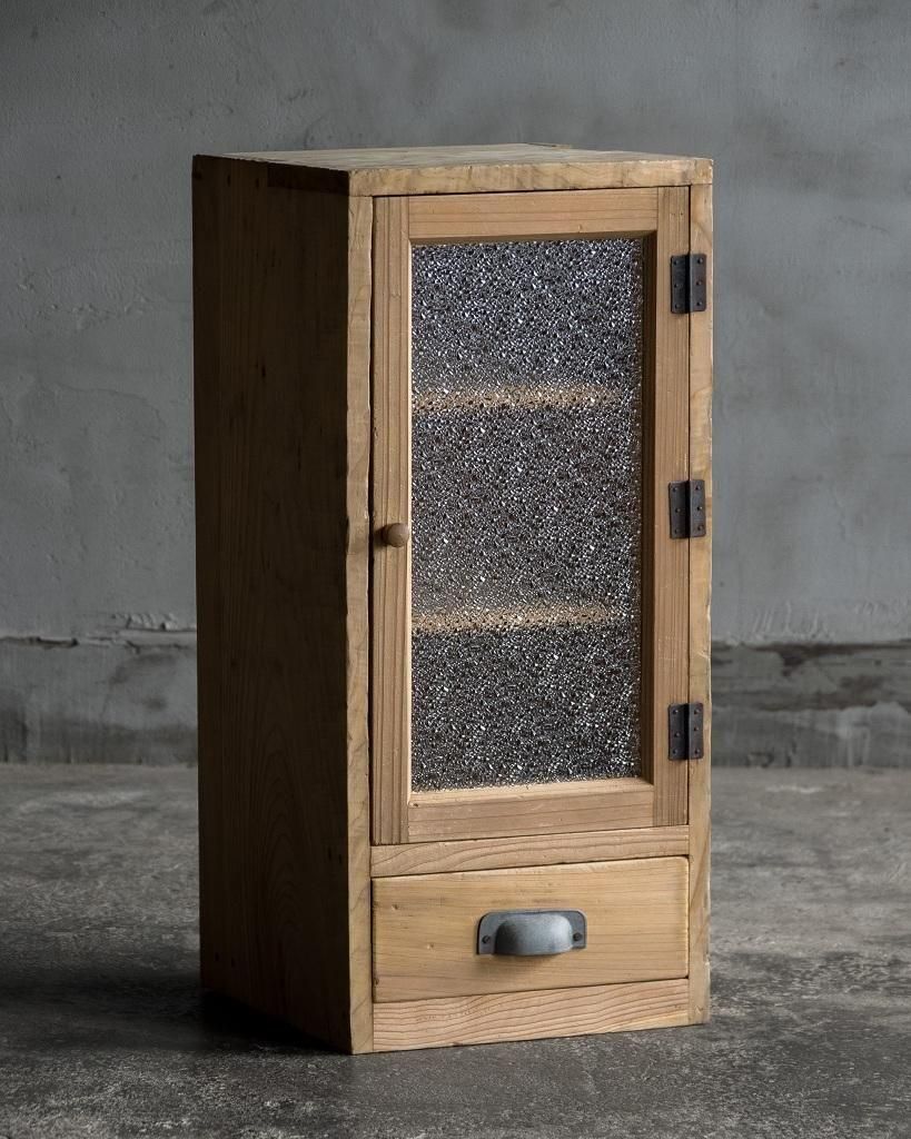 小ぶりながら棚板付きで収納力があり、木製つまみがささやかなアクセントになっています。