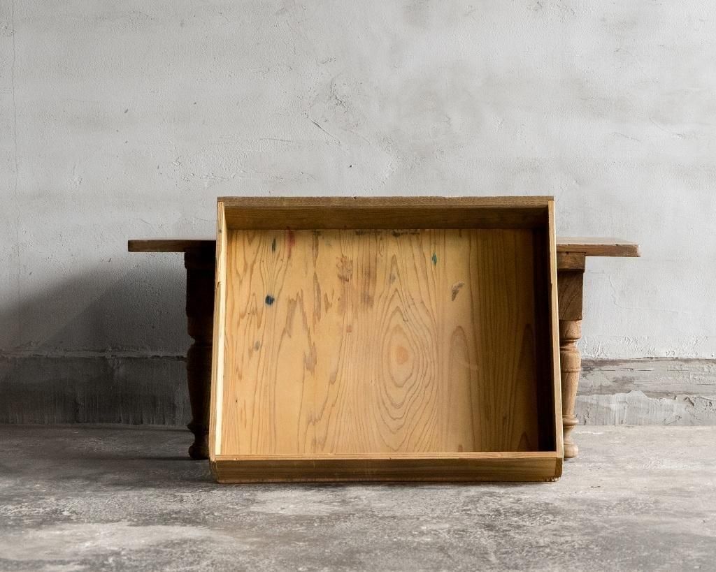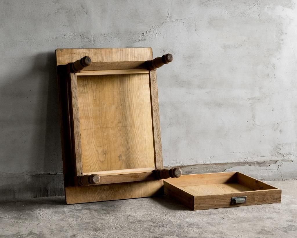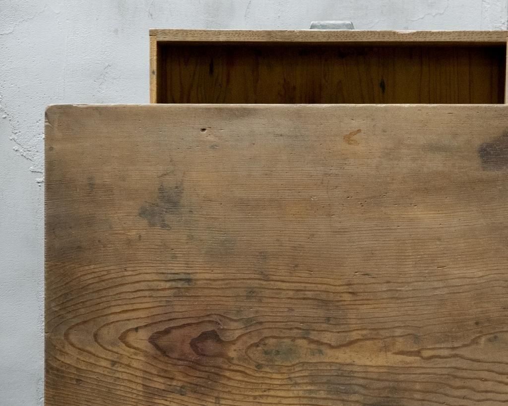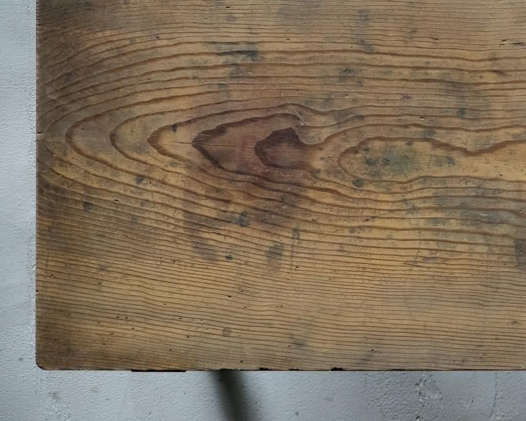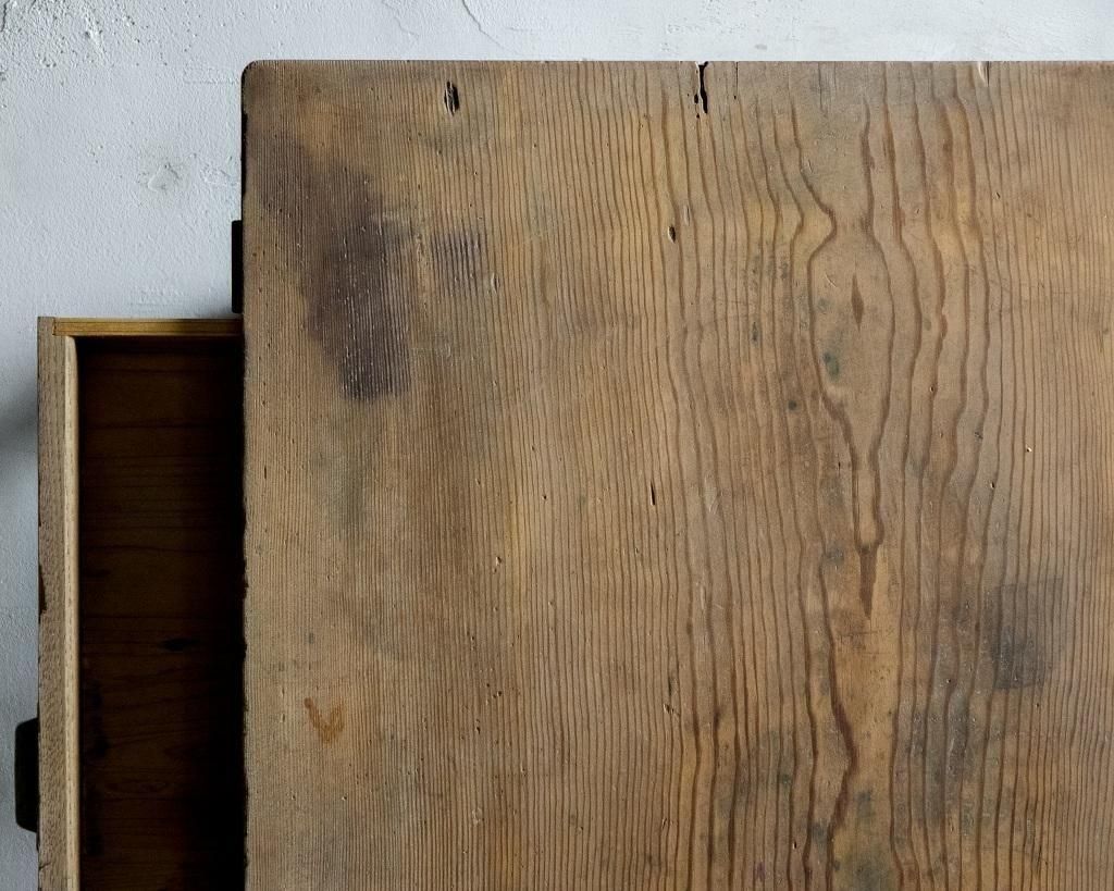 使い込まれた木肌には、インク汚れや擦れが残り、経年の味わいが感じられます。